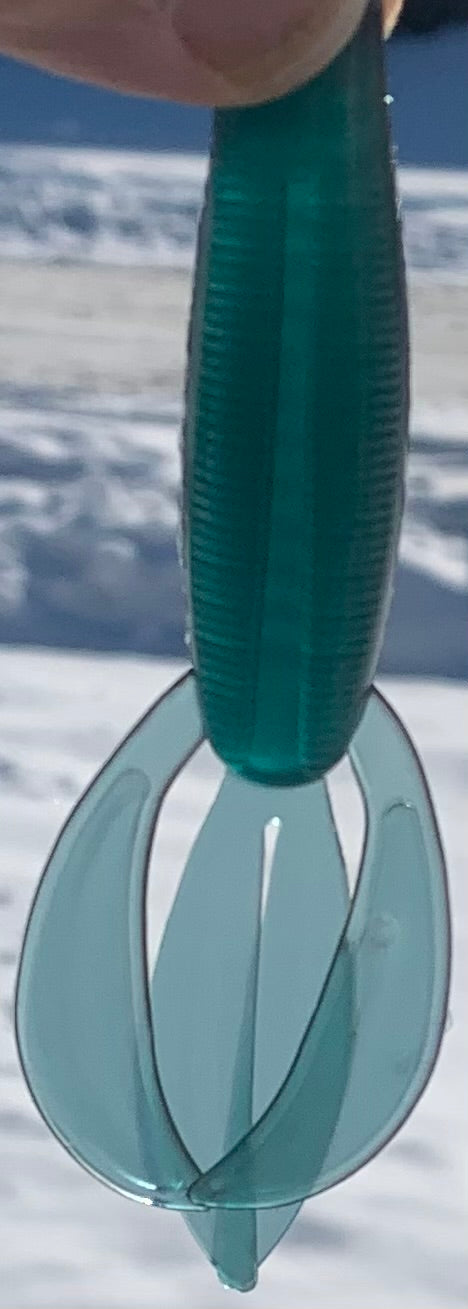 4.25” creature style bait with hook slot. This bait floats. This color is green pumkpin in thick areas and blue in thin areas. Turns blue in light. Qty 8 per bag