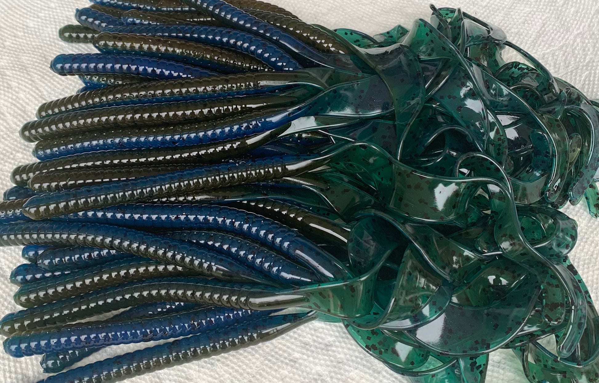 10 1/2” ribbon style worm made with no salt qty 8 per bag. Head will sink slowly with a 4/0 hook but tail will stay upright