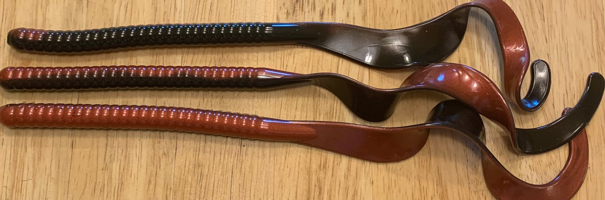 10 1/2” ribbon style floating worm made with no salt qty 8 per bag. Head will sink slowly with a 4/0 hook but tail will stay upright. Color has small amount of bleeding for affect