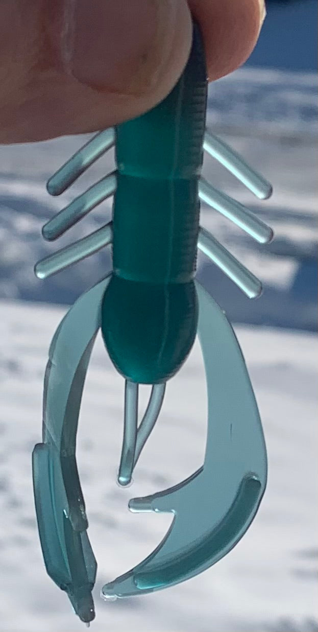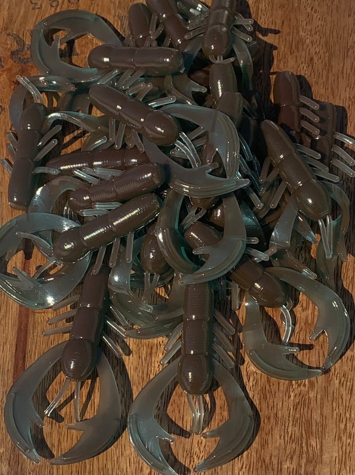 3” craw bait perfect trailer for finesse jig. No salt this bait floats. This color is green pumpkin in thick areas and blue in thin areas. When held to light whole bait turns blue. Qty 10 per bag