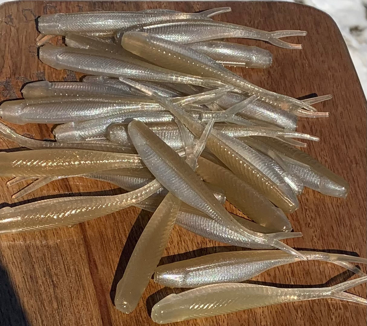 4” swimbait with fork tail. No salt and is made with very soft plastic and floats.. Qty 10 per bag