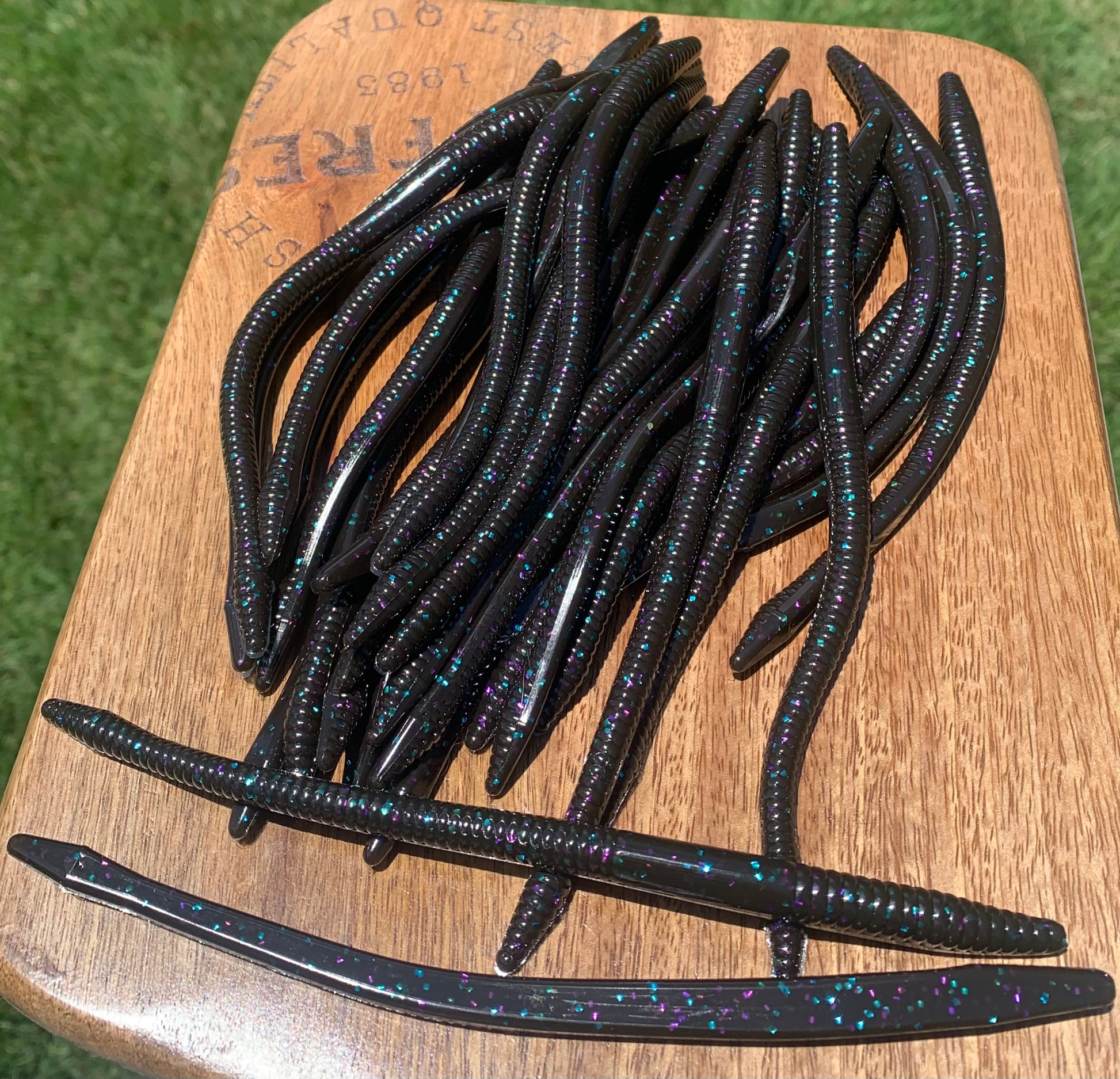 7” trick worm ribbed on top flat on bottom. This bait floats. Qty 10 per bag